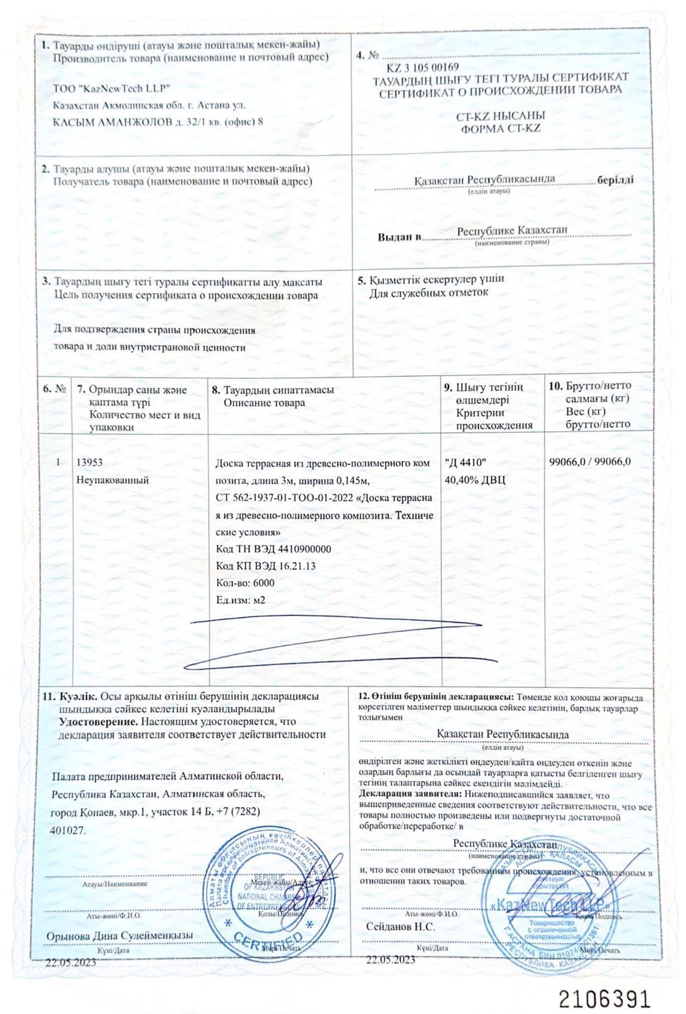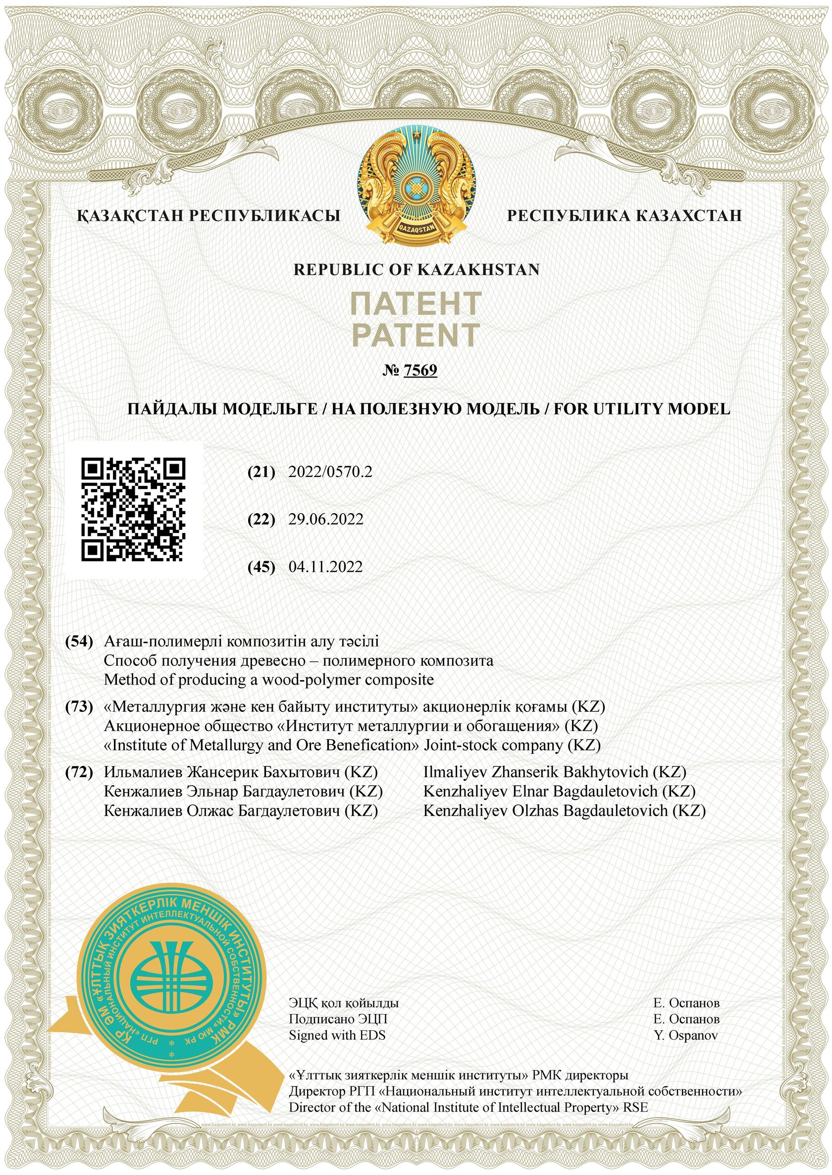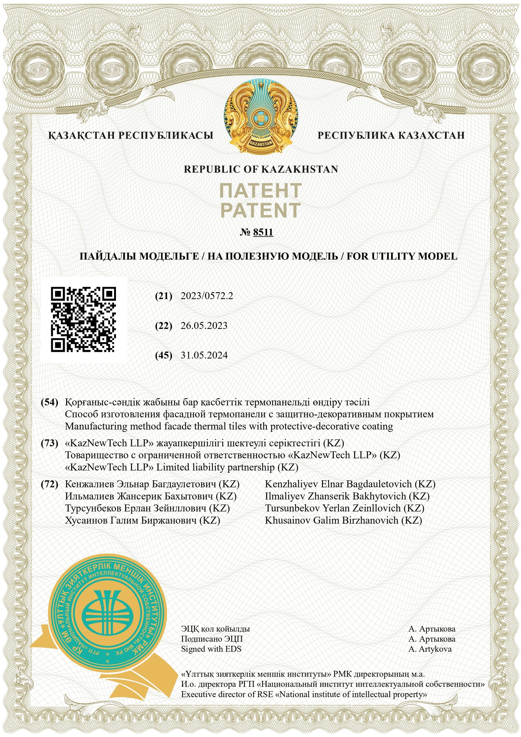 Патент Республики Казахстан №7569 Патент Республики Казахстан №8511 Сертификат о Происхождении Товара
